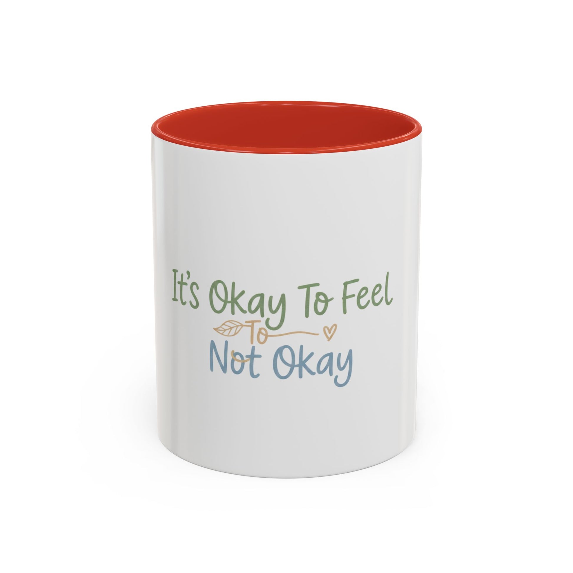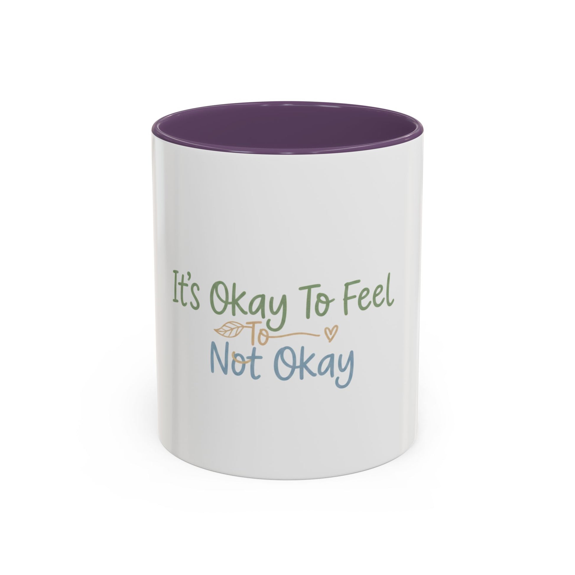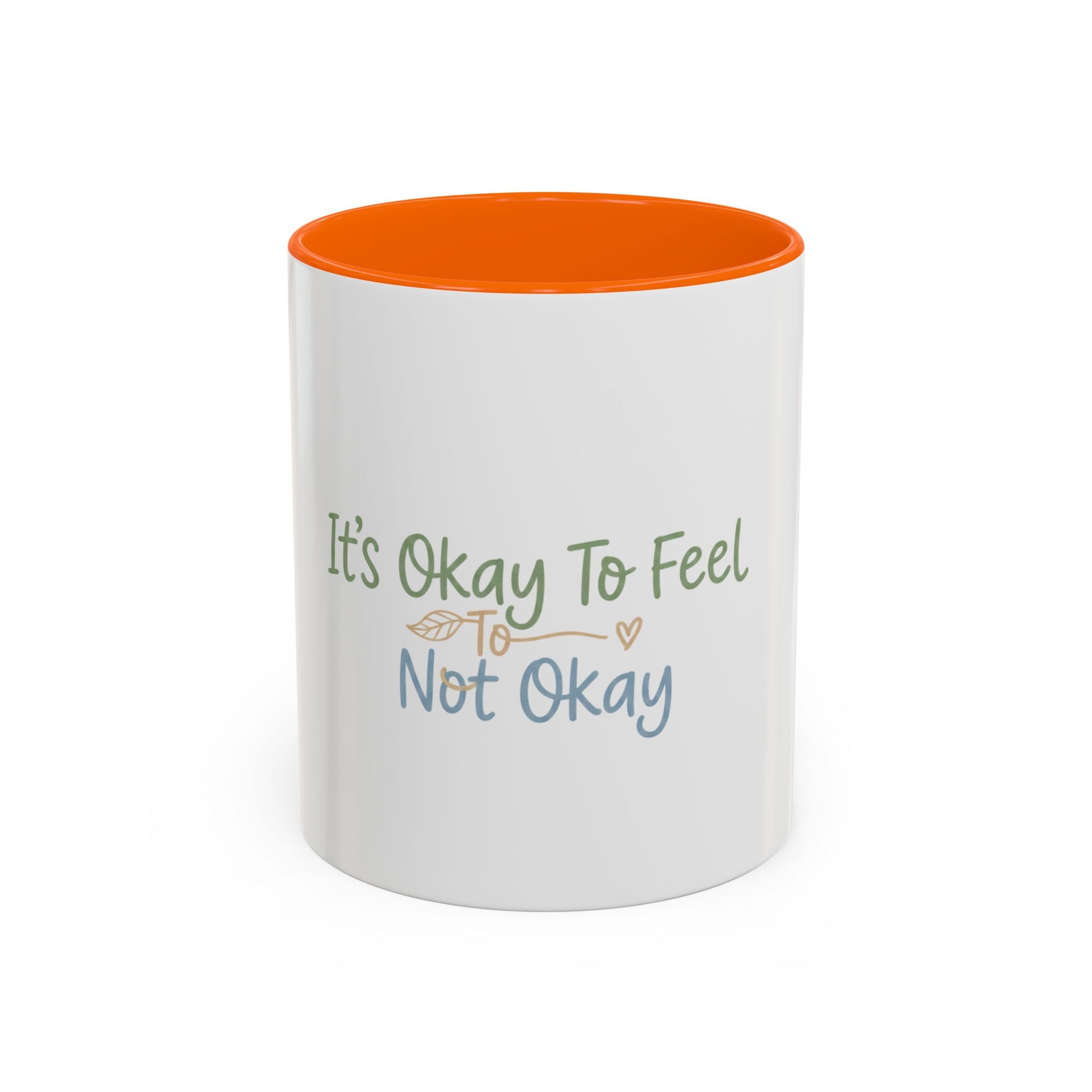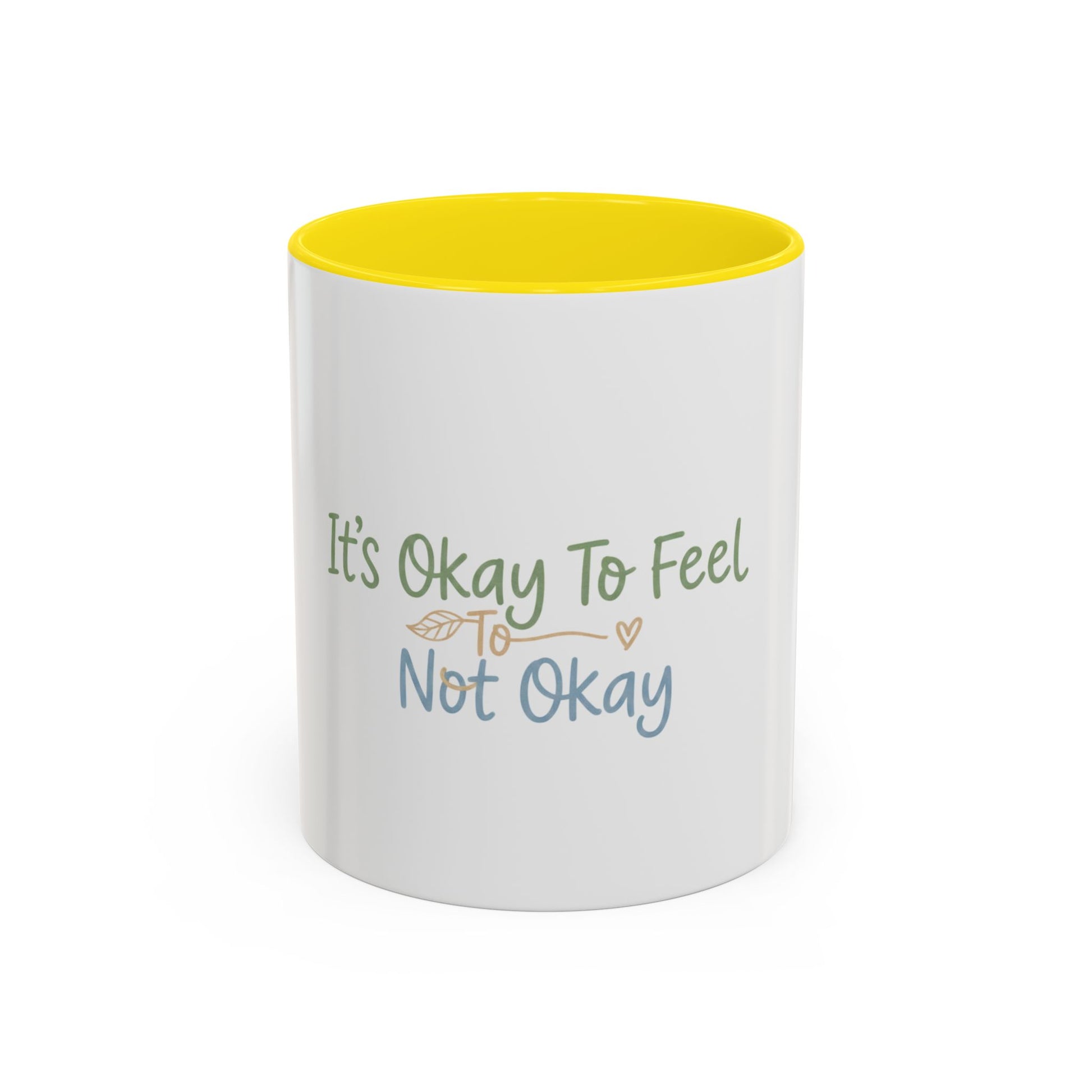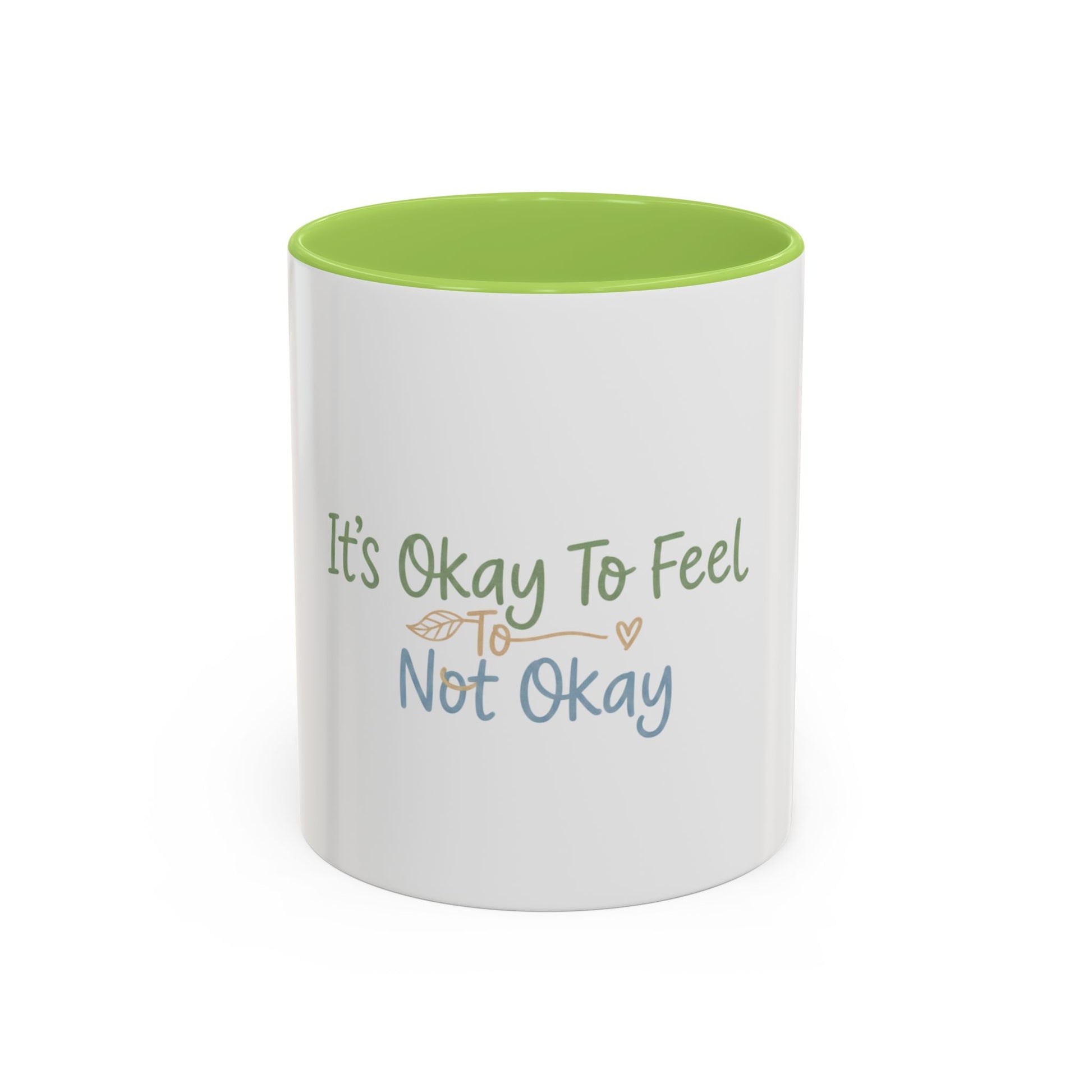 A gentle, everyday reminder for slow mornings and heavy days. This ceramic mug pairs a soft, hand-lettered message—"It's Okay To Feel To Not Okay"—with muted sage and powder-blue accents and a contrasting glossy handle and interior. It sits comfortably in your hands thanks to a classic C-shaped grip and holds either a cozy single-serve cup or an extra-long comfort pour. Use it while journaling, on a quiet work break, or beside a friend who needs a calm, honest nudge. The message reads like a quiet companion: calm, compassionate, and steady—fit for bringing a little ease to routine moments and meaningful conversations alike.