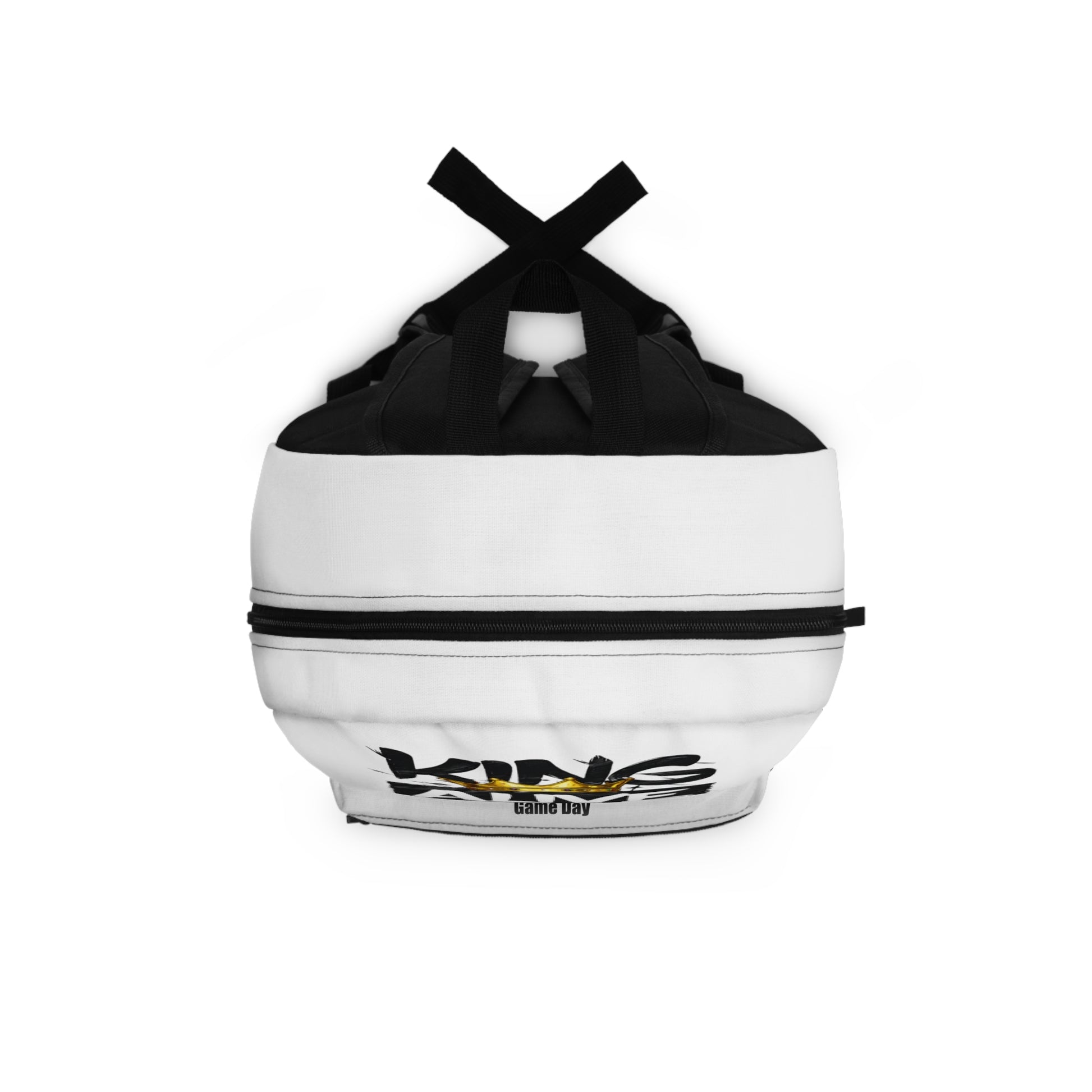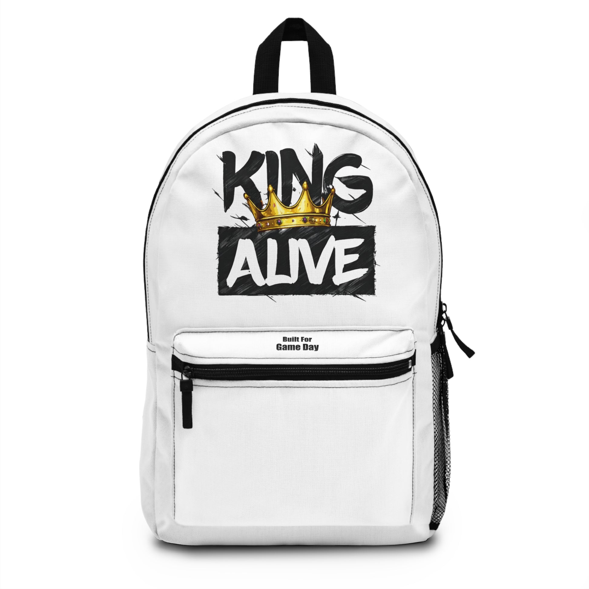 Carry a bold statement with everyday utility. This backpack blends rugged, lightweight polyester with a confident street-art graphic—black spray-lettering and a distressed gold crown that reads “King Alive.” It sits comfortably on the back with padded mesh support and adjustable straps, keeps tech safe in an internal laptop/tablet sleeve, and organizes essentials across four zippered compartments and an external bottle pocket. Built to move with you, it dries quickly and holds its shape through daily commutes, studio sessions, or short trips out of town.