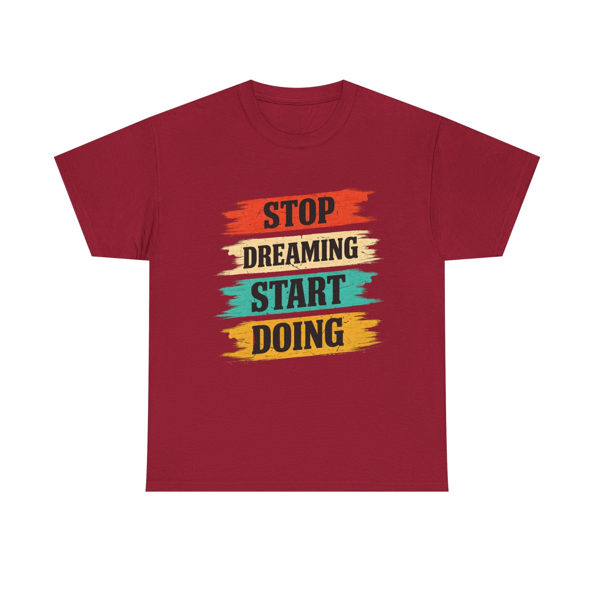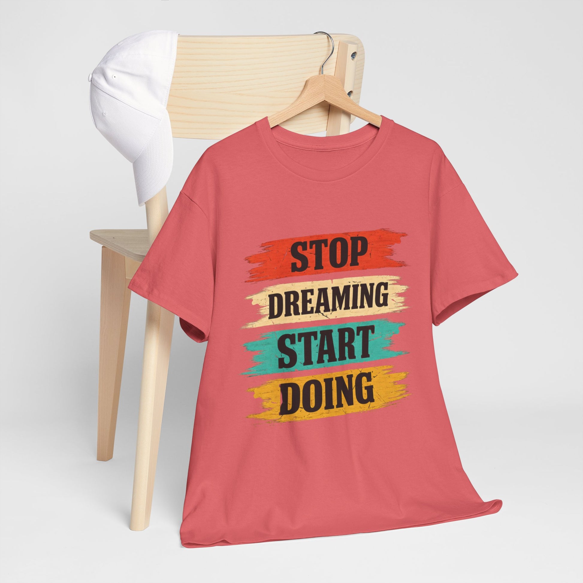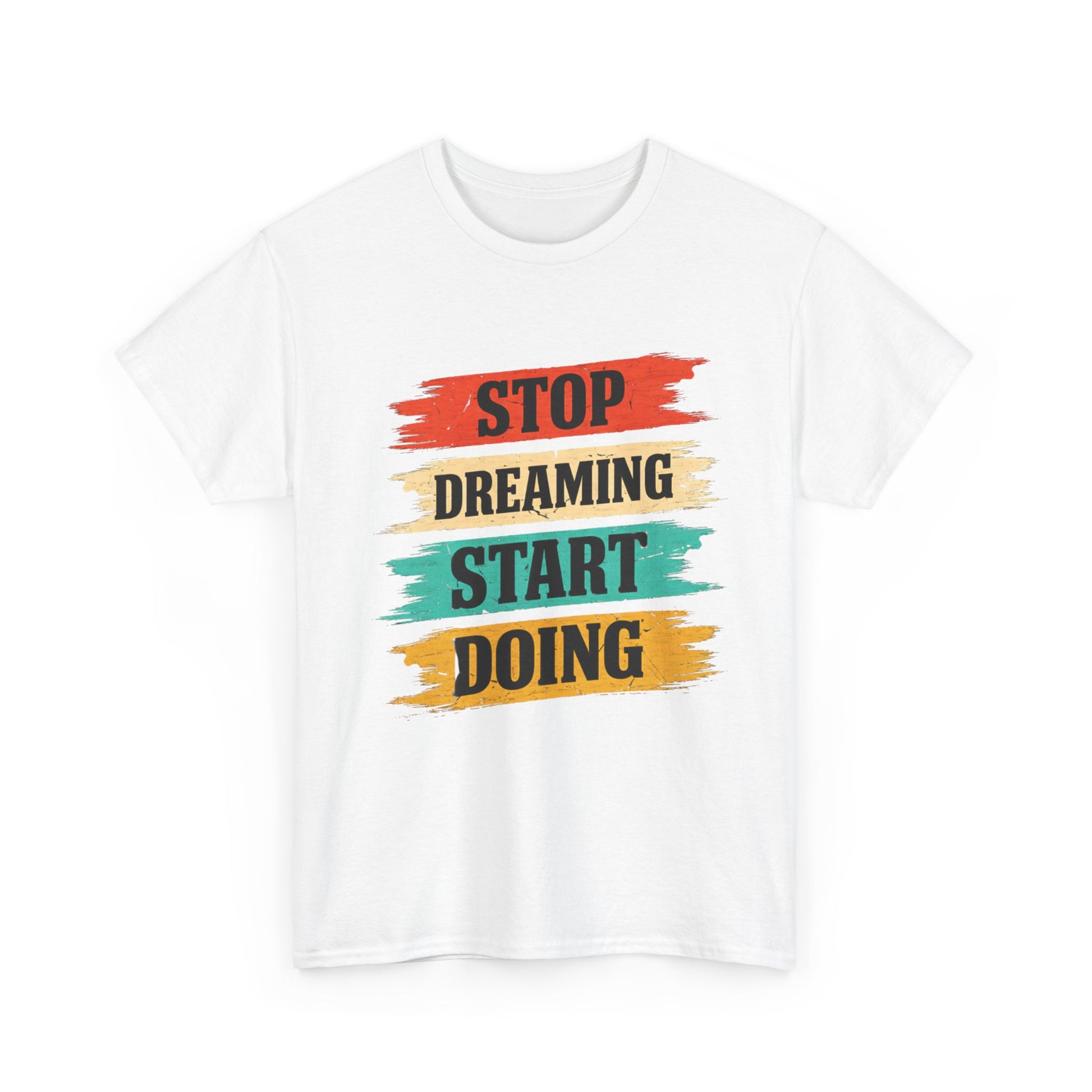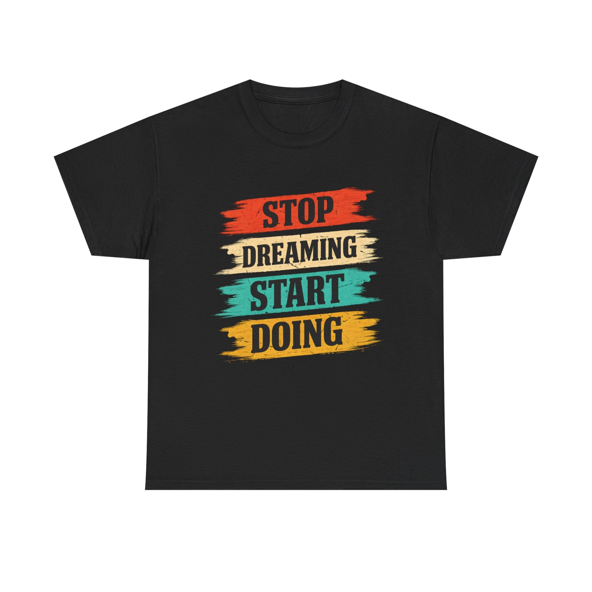 This lightweight classic tee carries a bold, action-forward message across colorful brushstroke bands: "STOP DREAMING / START DOING." Soft, breathable cotton and a relaxed crew fit make it easy to throw on for a morning run, a creative session, or a day of getting things done. The print uses crisp DTF and DTG methods for vivid, long-lasting color, and the tubular knit construction keeps the silhouette clean and simple. Wear it when you need a quiet push — it reads like a nudge from a friend, not a slogan. The removable tear-away label and reinforced shoulder tape keep comfort and shape front and center, so the shirt stays reliable through routines and plans in motion.