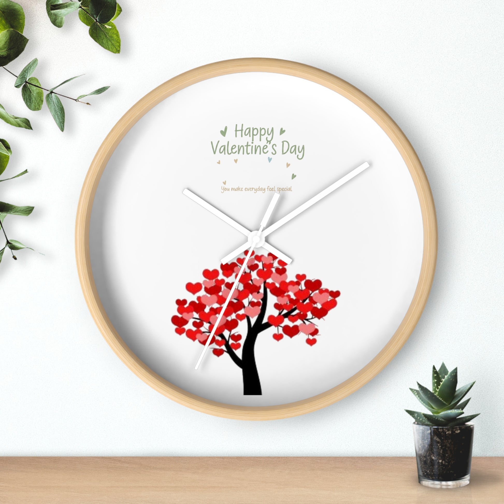 Soft, quiet, and full of heart — this wall clock brings a gentle Valentine’s mood to any room. A slender black frame surrounds a crisp plexiglass face printed with a tree whose red heart-shaped leaves seem to flutter in slow motion. The silent mechanism keeps late-night conversations and cozy mornings uninterrupted, while the pre-installed hook makes it simple to hang above a bedside, a mantel, or in a snug reading nook. Subtle text overhead adds a tender note without overpowering the design. Use it to mark ordinary minutes into small, shared moments of warmth.